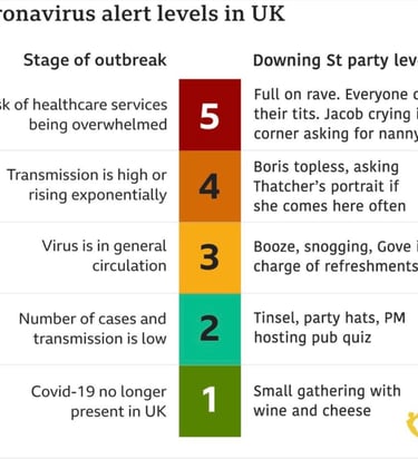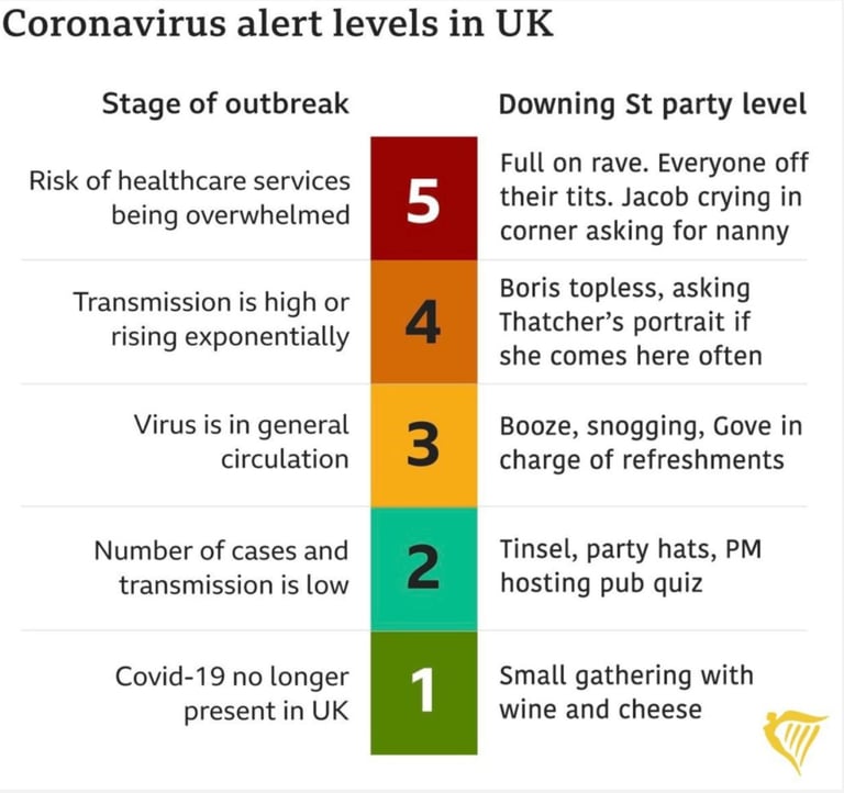 Na ilustração acima, à esquerda, está a escala real do nível de contágio e riscos associados à manutenção dos serviços públicos na Grã Bretanha, variando do nível 1, o mais leve, quando a Covid-19 não estaria mais presente no Reino Unido, até o nível 5, indicando um risco de colapso do sistema de saúde, o nível mais grave. À direita da imagem, há uma referência ao potencial das festas do governo britânico, indo de uma simples reunião com queijos e vinhos, nível 1, até uma Rave completa, com todos se divertindo intensamente, nível 5.