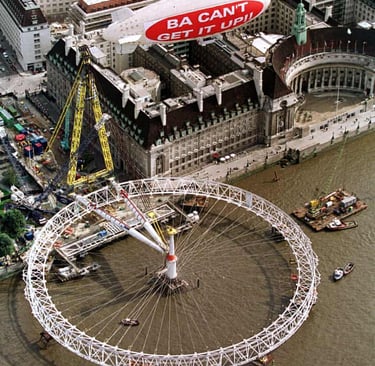 Richard Branson, dono da Virgin Atlantic, aproveitou um problema técnico com a construção do London Eye para ganhar sobre a concorrente e patrocinadora do monumento, British Airways. Venha pra cima, clique aqui...