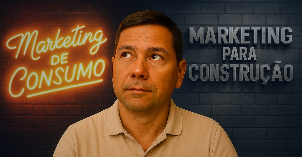 No consumo, o marketing explora imagens e emoção para decisões rápidas. Já no setor da construção, decisões impulsivas custam caro. Aqui, marketing exige profundidade, consistência e autoridade técnica para gerar previsibilidade.